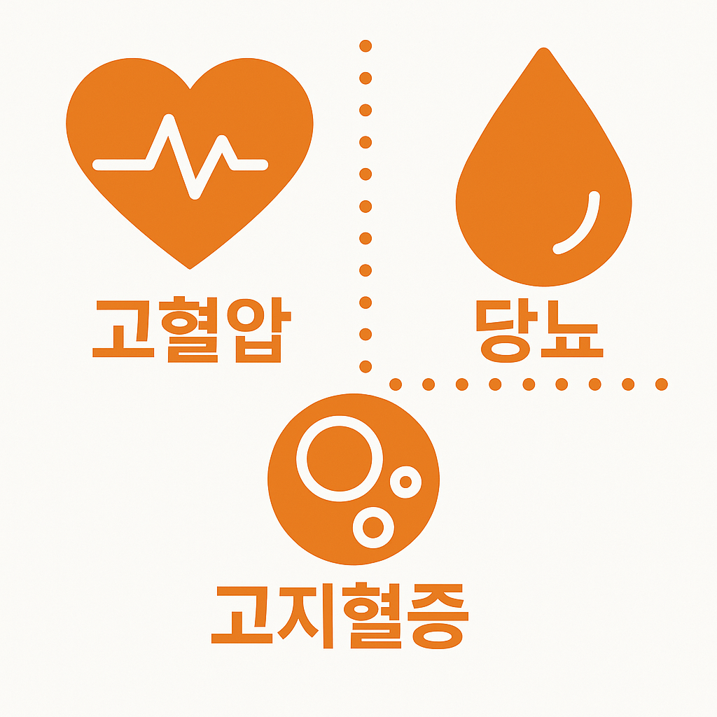 출처: 대한고혈압학회 진료지침, 대한당뇨병학회 관리지침, 질병관리청 국가건강정보포털, 한국지질·동맥경화학회 권고안